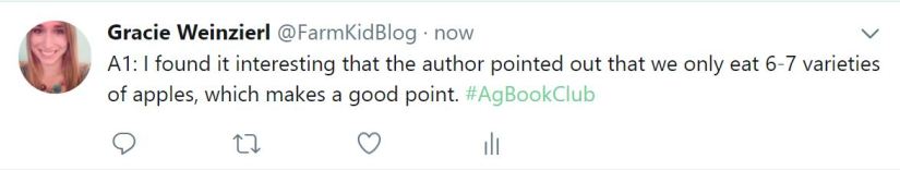 Notice that each tweet starts with the Q (for the moderator) or the A (for participant’s answer) with the number following it. The number represents the question number, so that we can keep the chat organized. These chats will ask around 7 questions during our hour-long discussion. Each example tweet also includes the hashtag (#AgBookClub) so that all participants can see and follow the conversation.